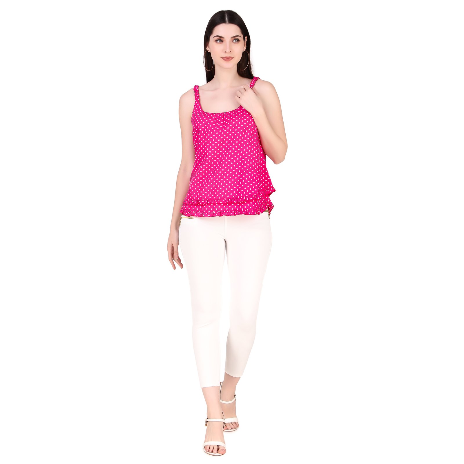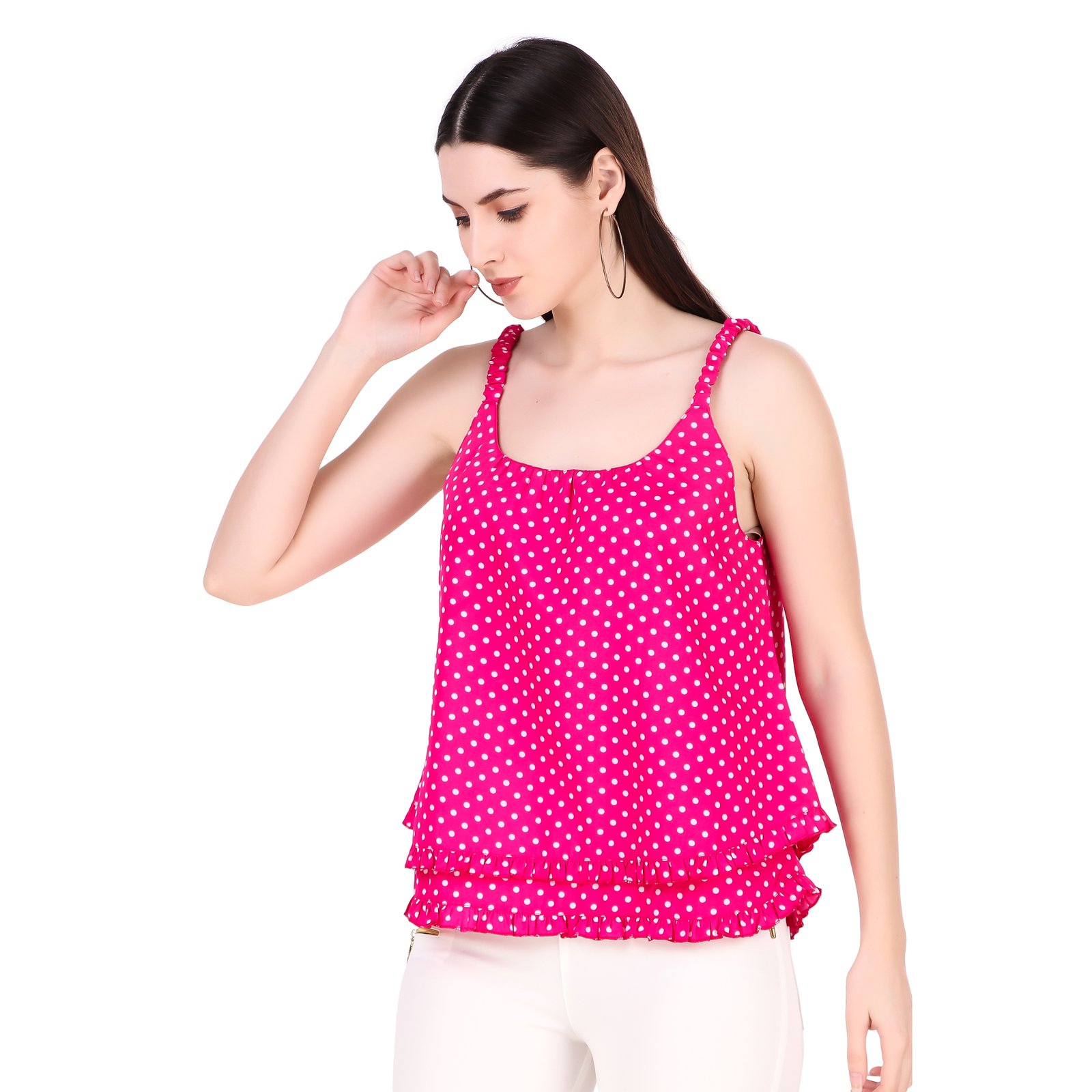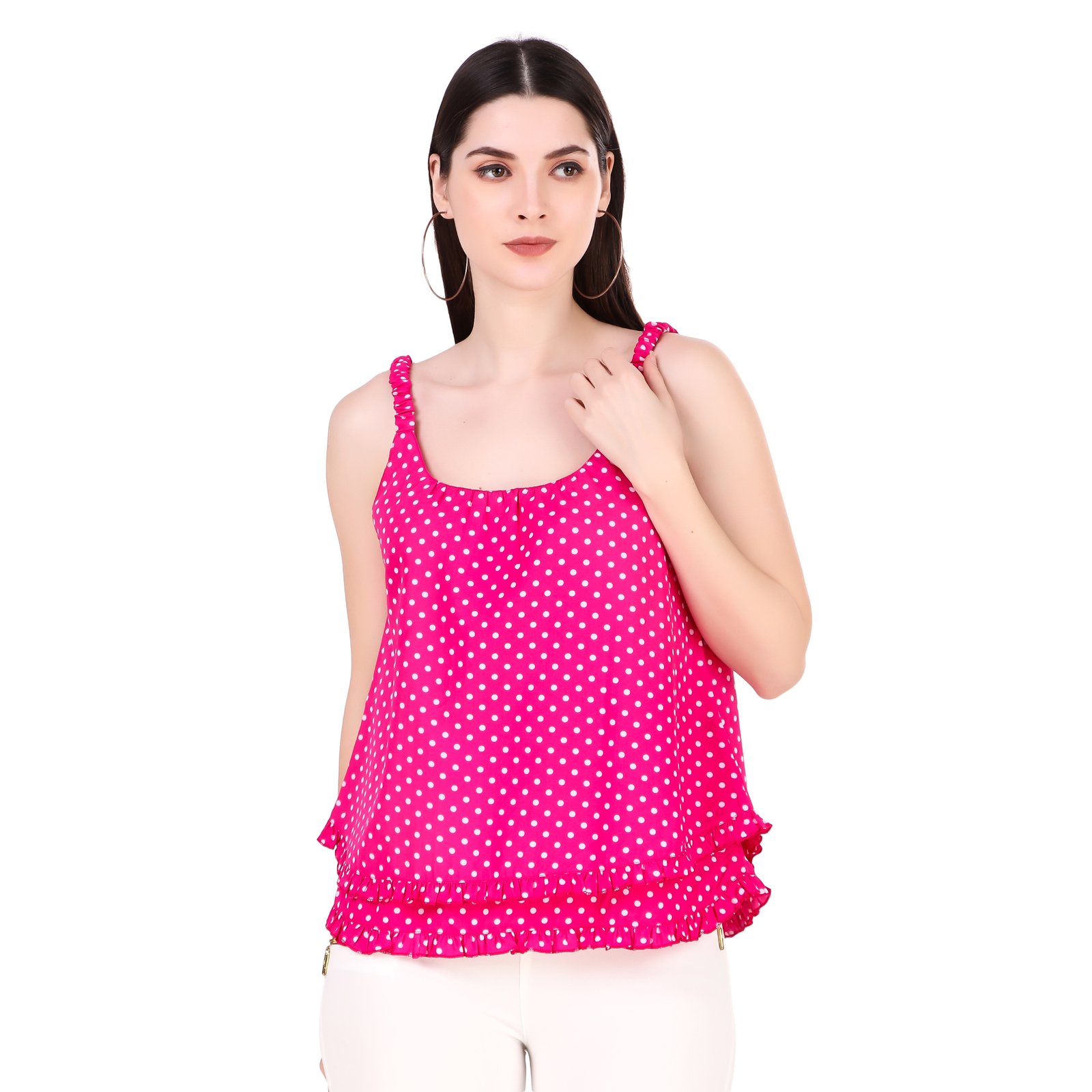 This beautiful polka printed top wich made high quality fabric with beautiful print all over. this top has been designed keeping in mind the letest trends in contempory casual fashion. the top combines western with the fashion of today !