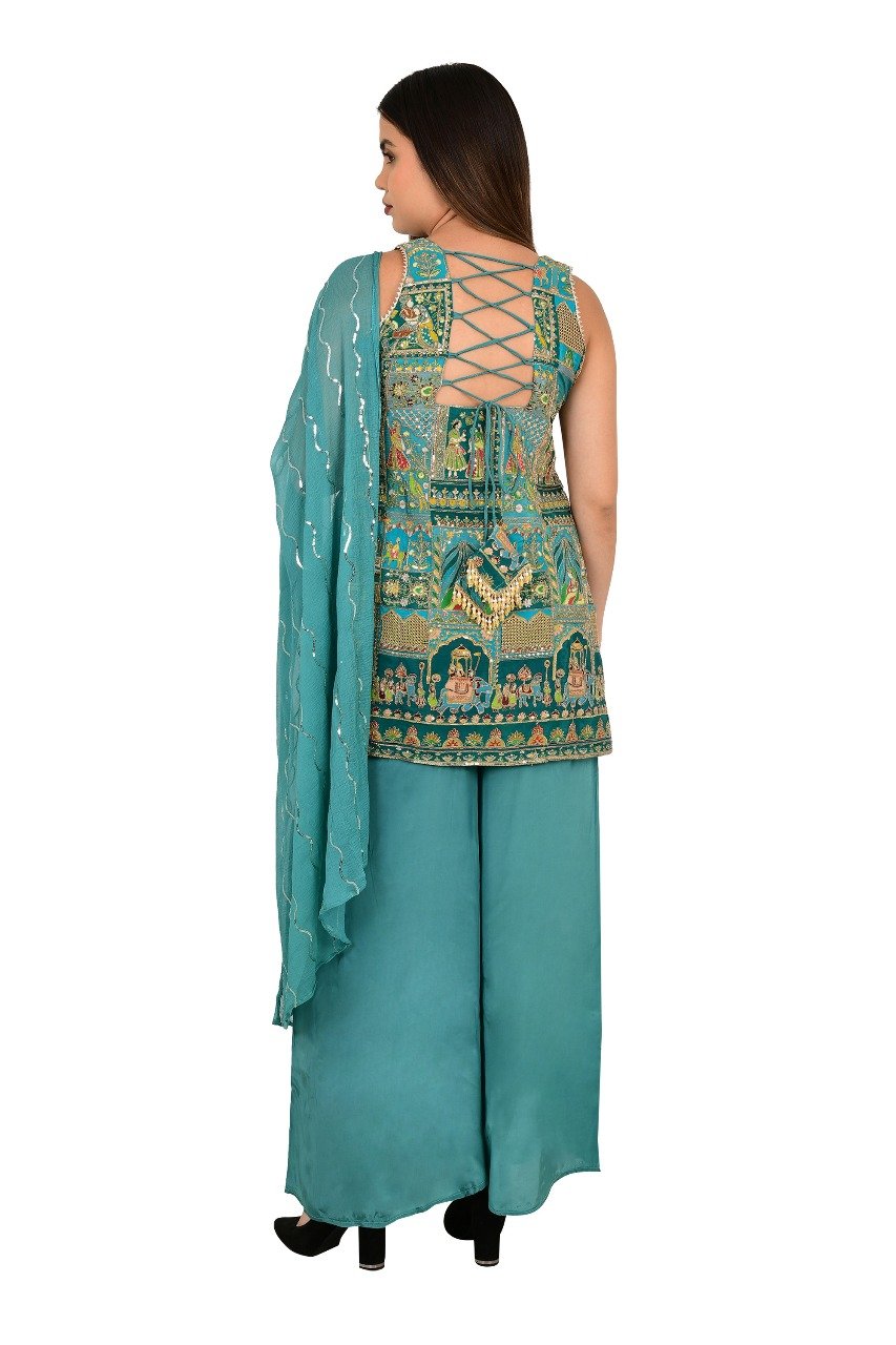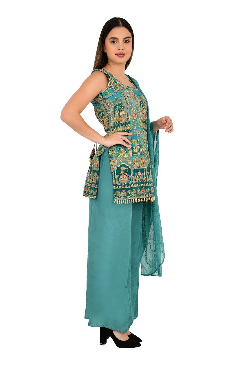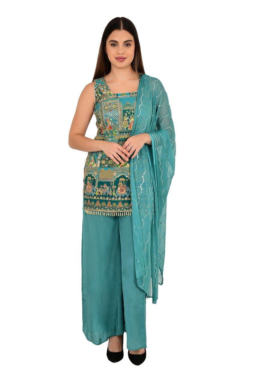 -” Trendy Raja Rani Sharara”3 piece set# made pure dashine crepe fabric with zari sequins work and digital printing.